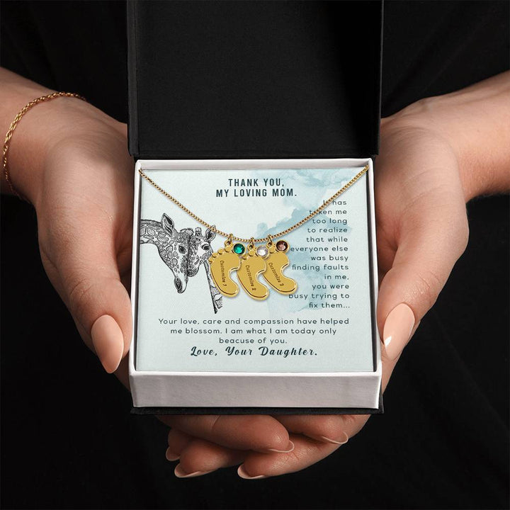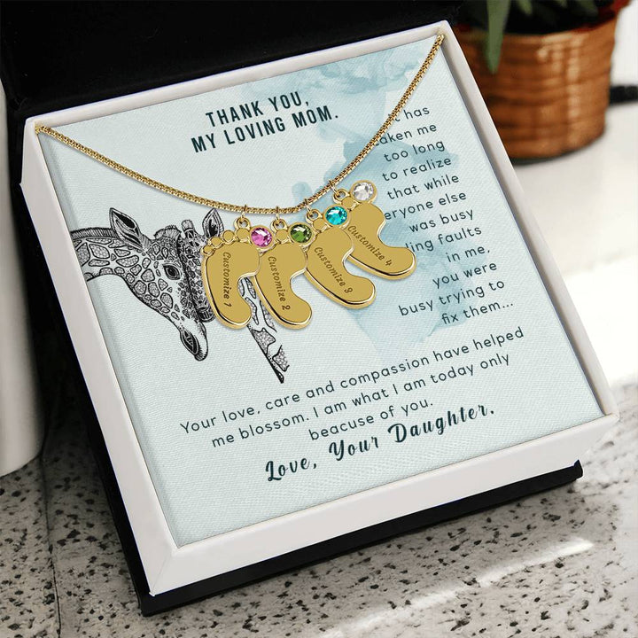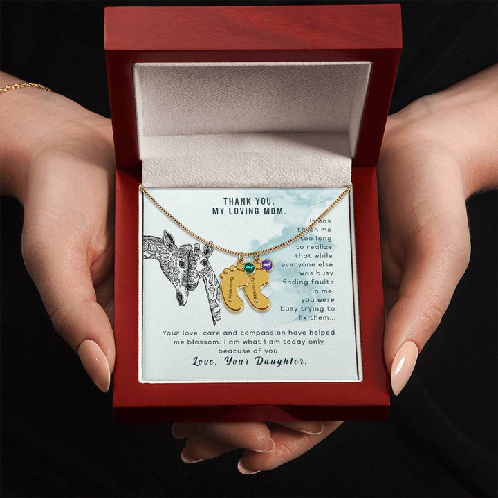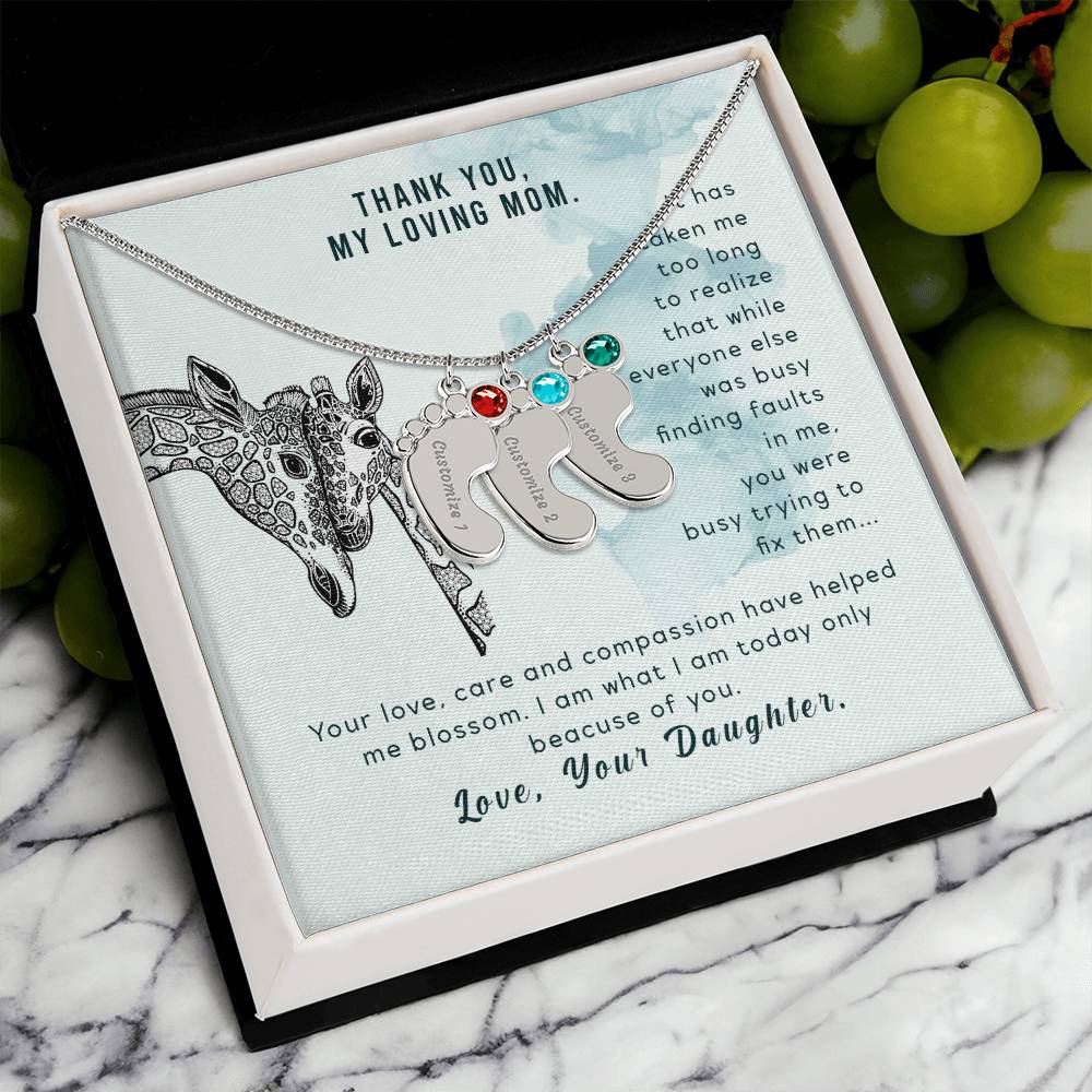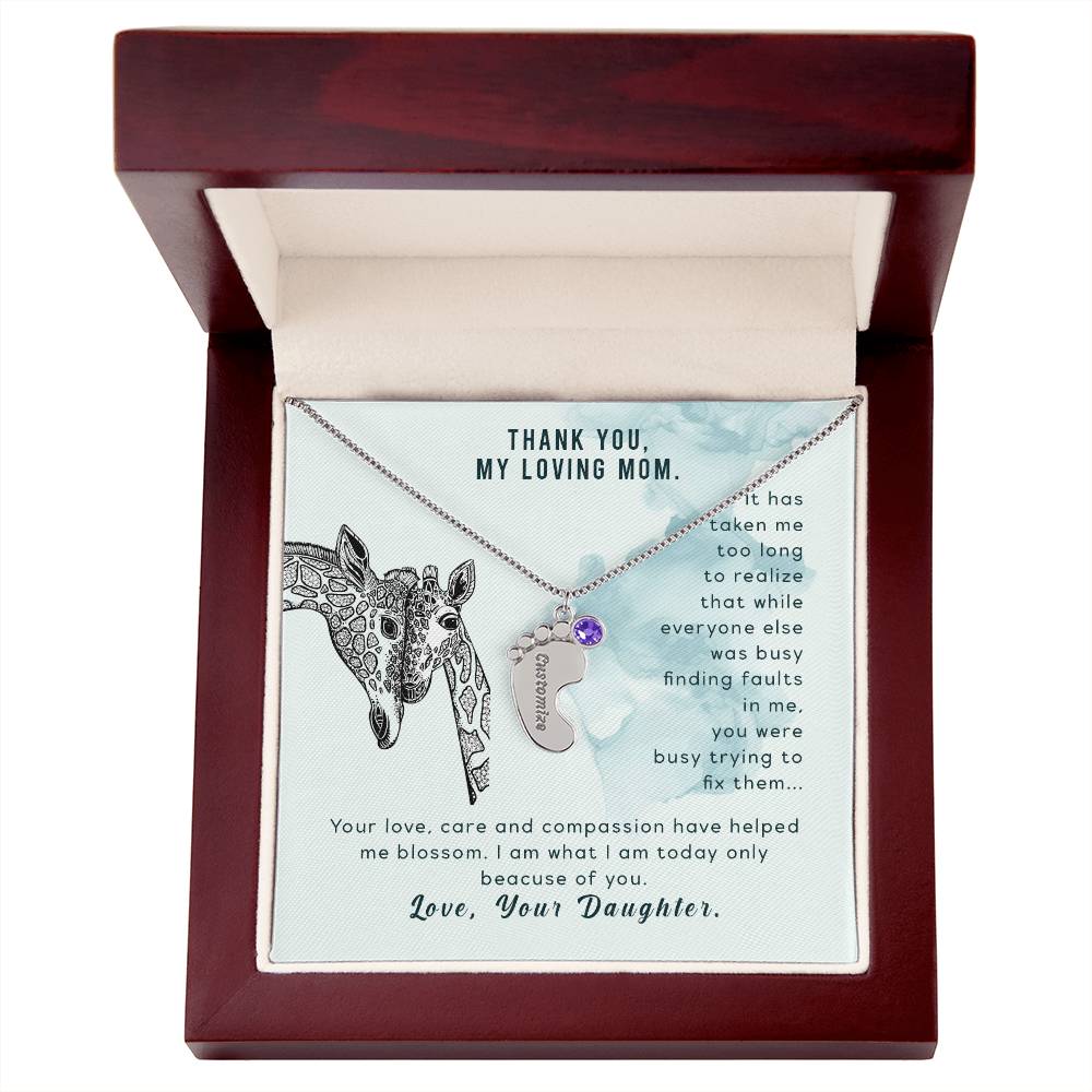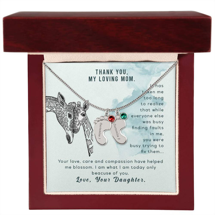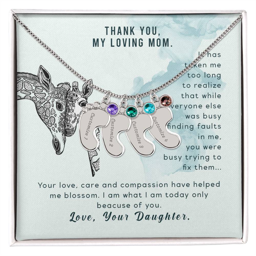 Thank You, My Loving Mom | Your Love, Care and compassion have helped me blossom - Baby Feet Necklace with Birthstone