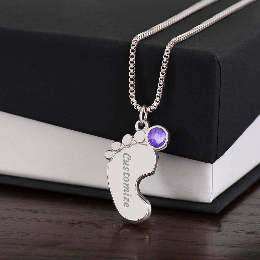 Celebrate the arrival of a newborn or cherish a precious memory with our Custom Baby Feet Necklace with Birthstone. Personalize your gift by engraving a name of your choice onto the pendant and choosing a crystal that correlates with the baby's birth month. And by picking multiple pendants, a custom present like this is perfect for moms and grandmothers with big families. This is a one-of-a-kind keepsake that will be treasured for a lifetime!