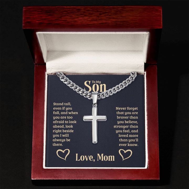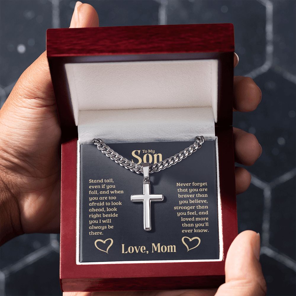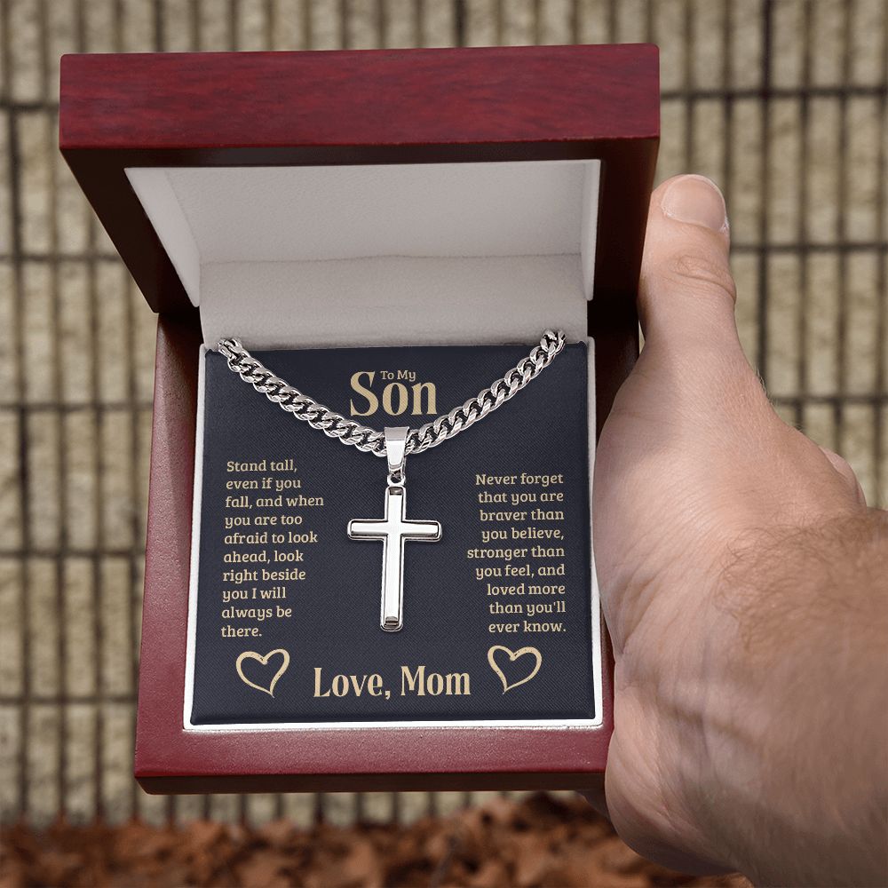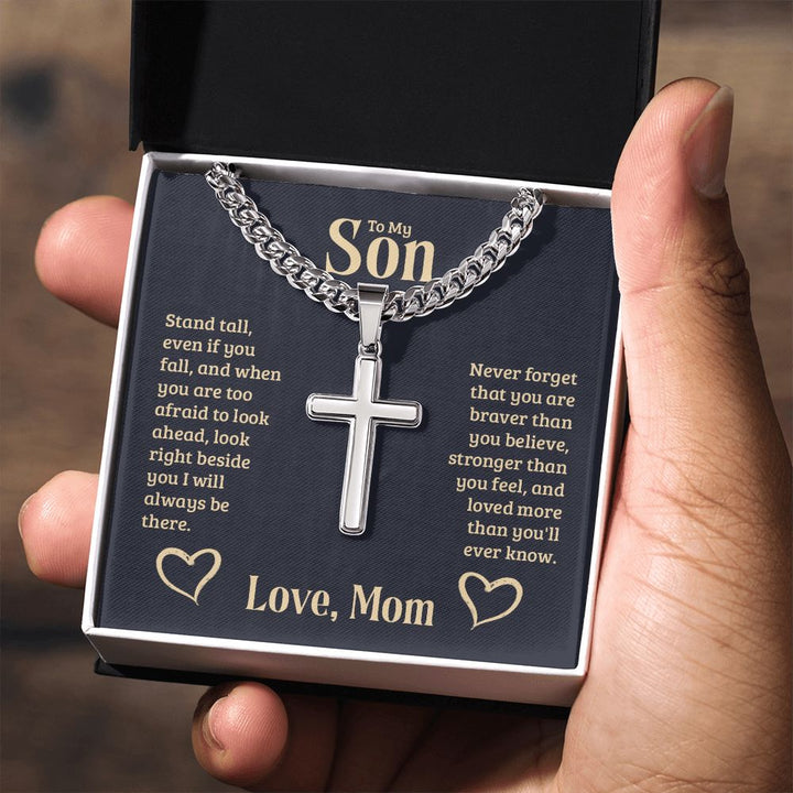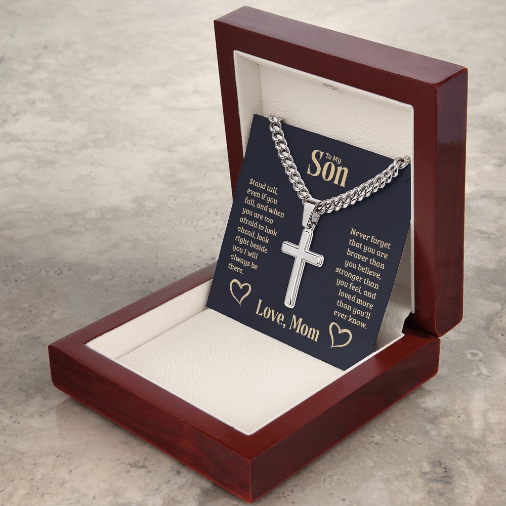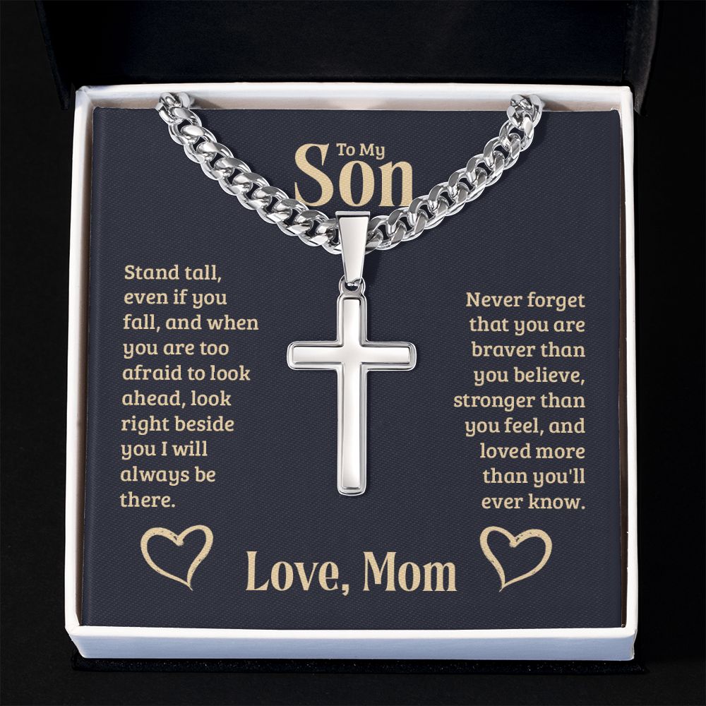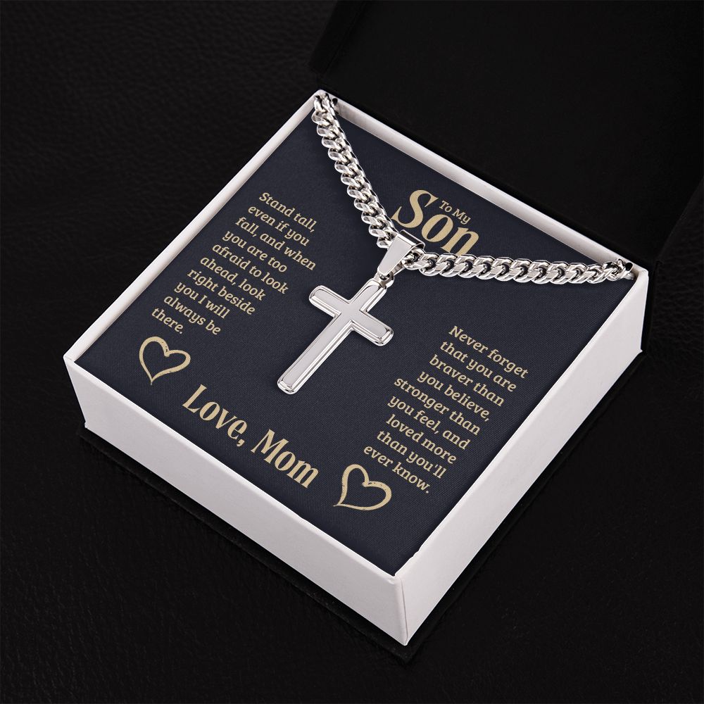 To My Son | Never forget that you are braver than you believe, stronger than you feel, and loved more than you'll ever know. Love, Mom - Cuban Chain with Artisan Cross Necklace