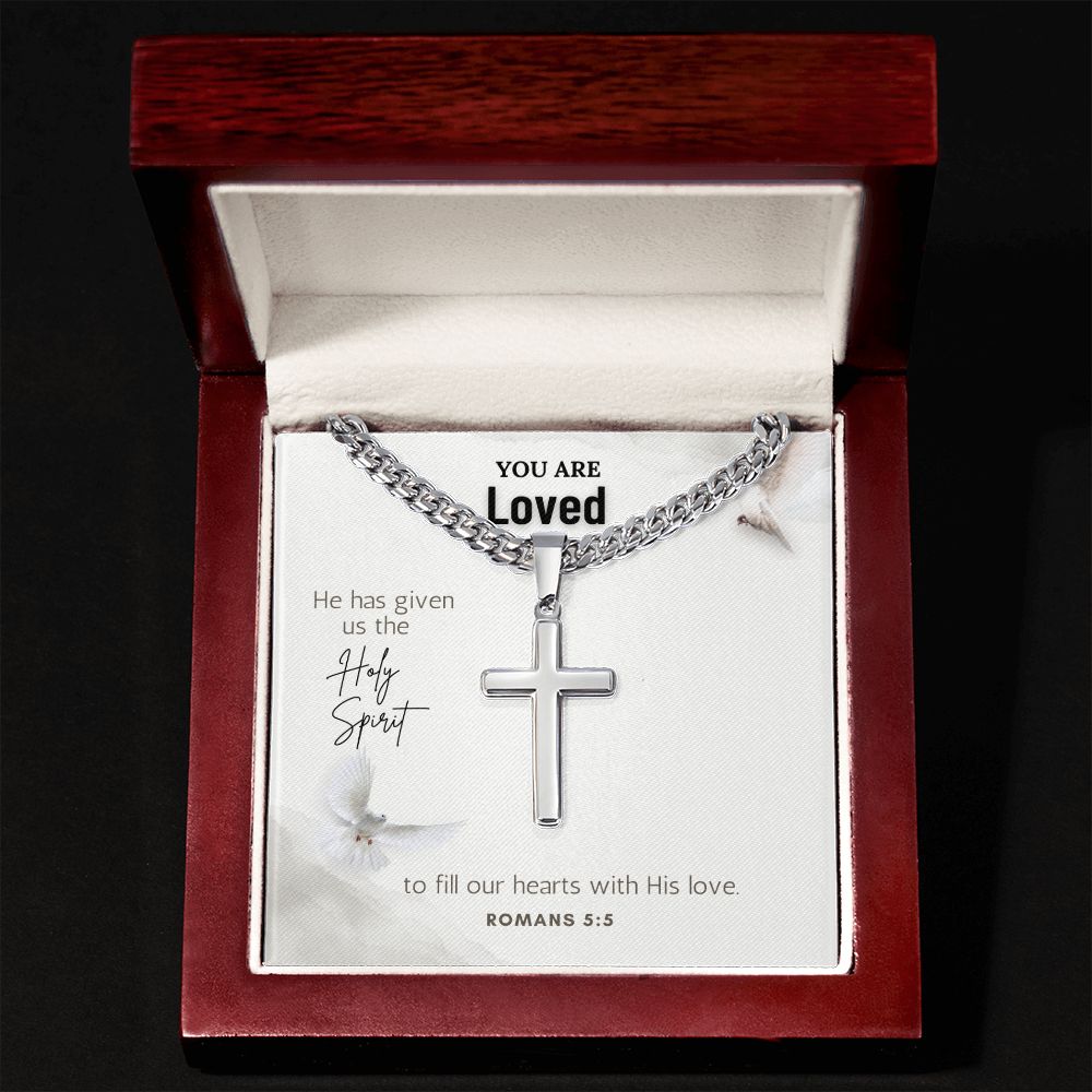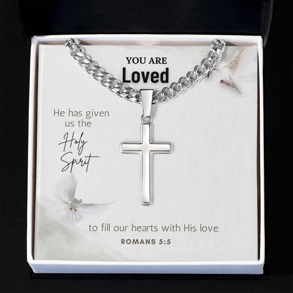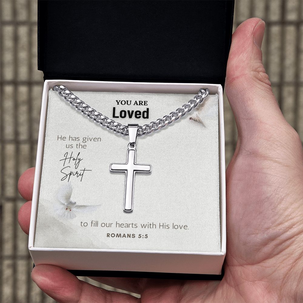 You are Loved | He has given us the Holy Spirit to fill our hearts with His love. Romans 5:5 - Cuban Chain with Artisan Cross Necklace