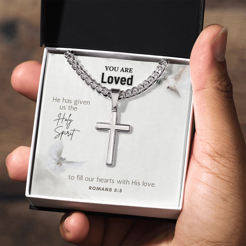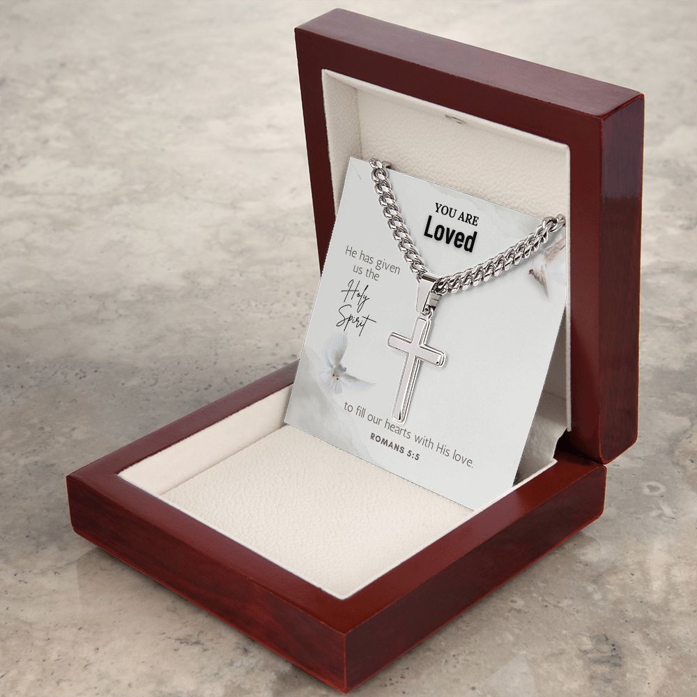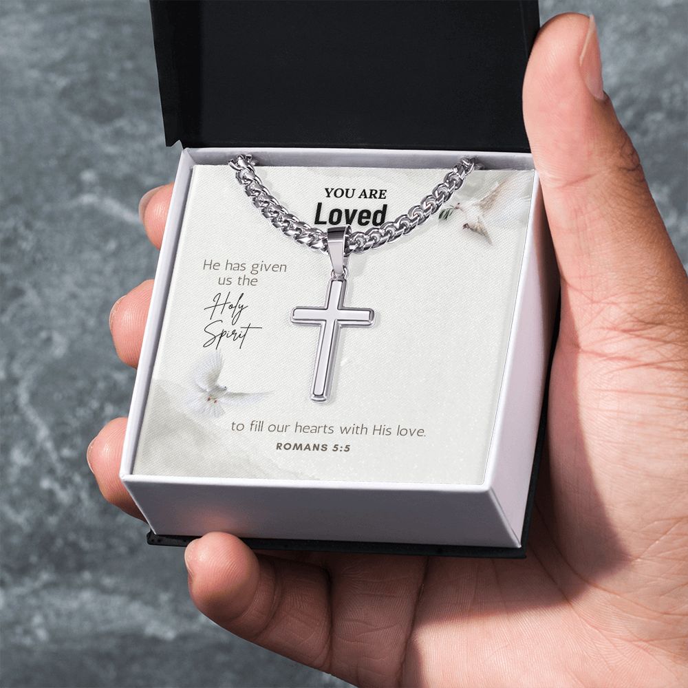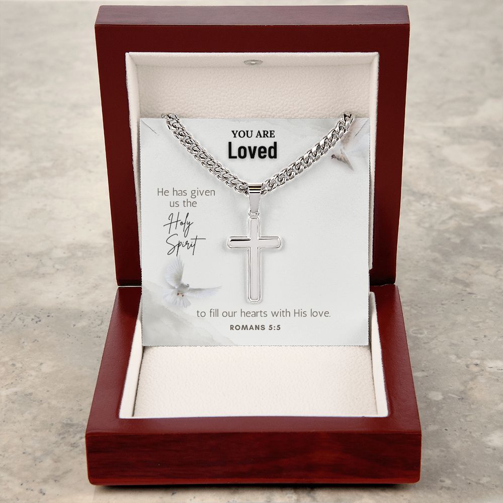 You are Loved | He has given us the Holy Spirit to fill our hearts with His love. Romans 5:5 - Cuban Chain with Artisan Cross Necklace