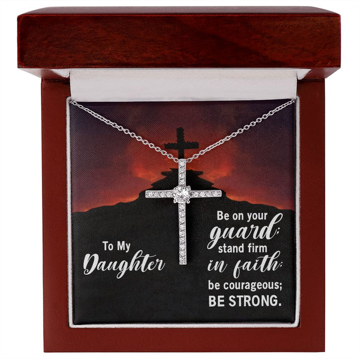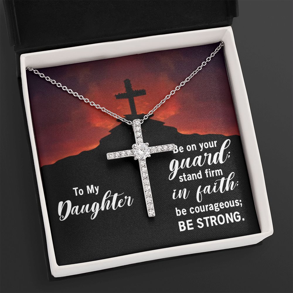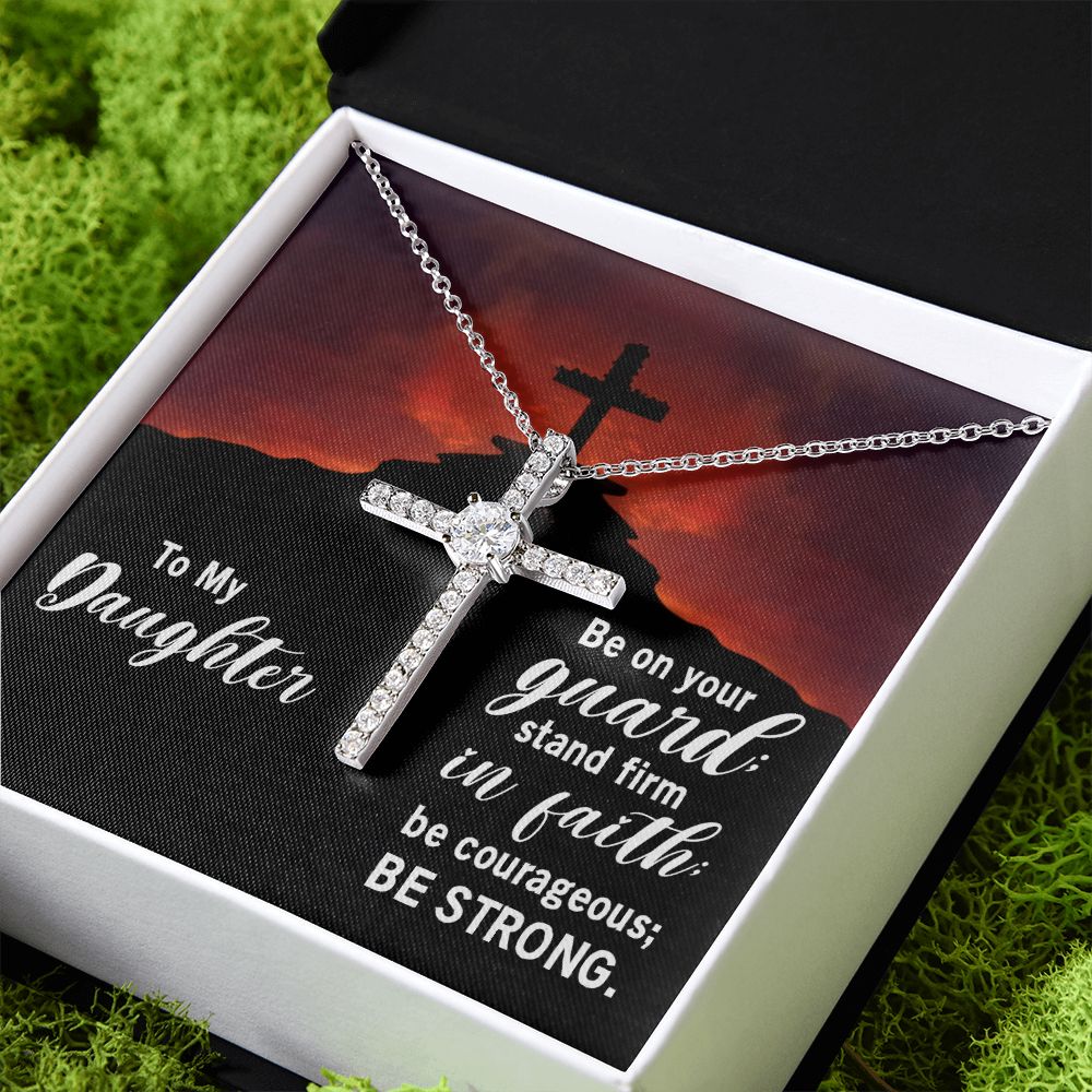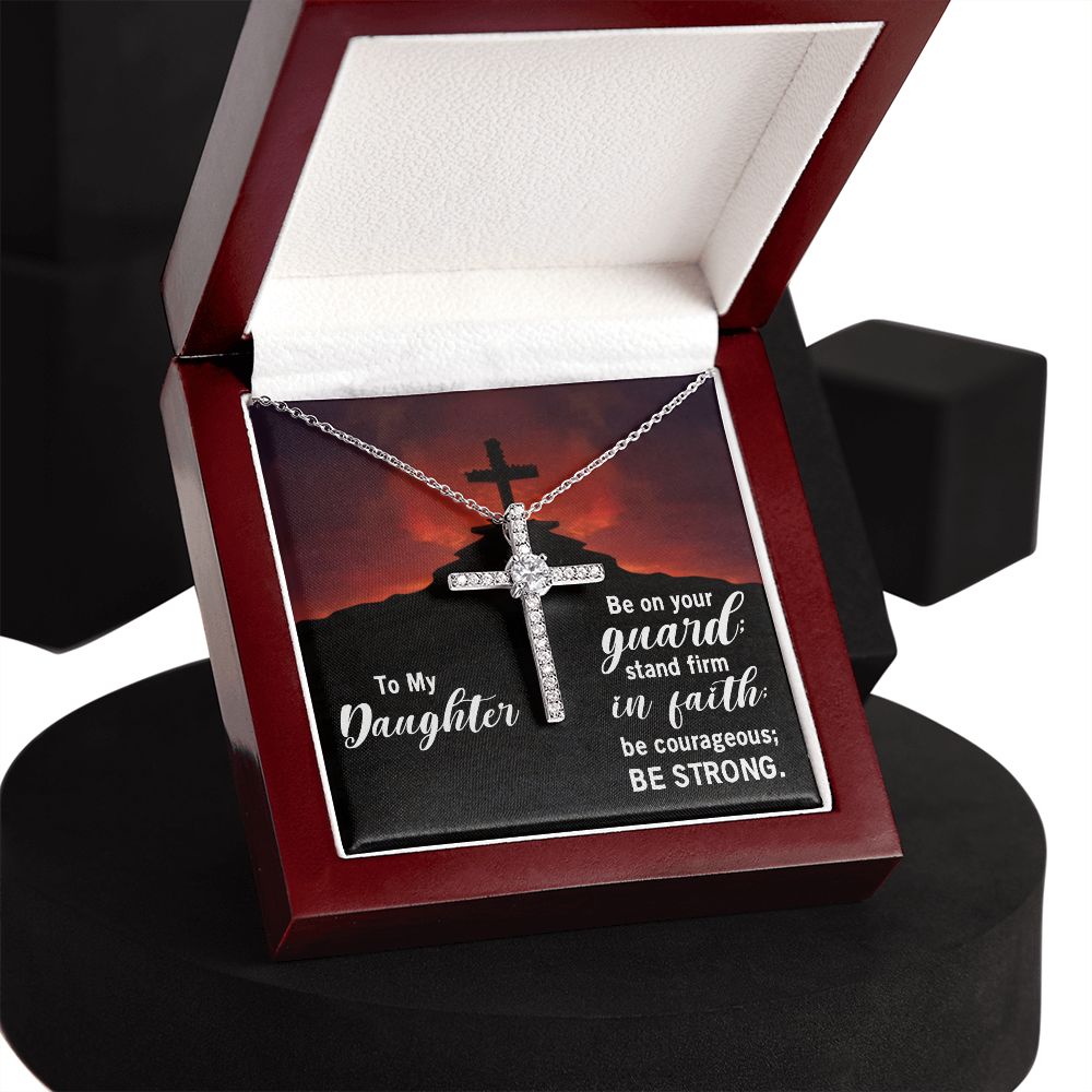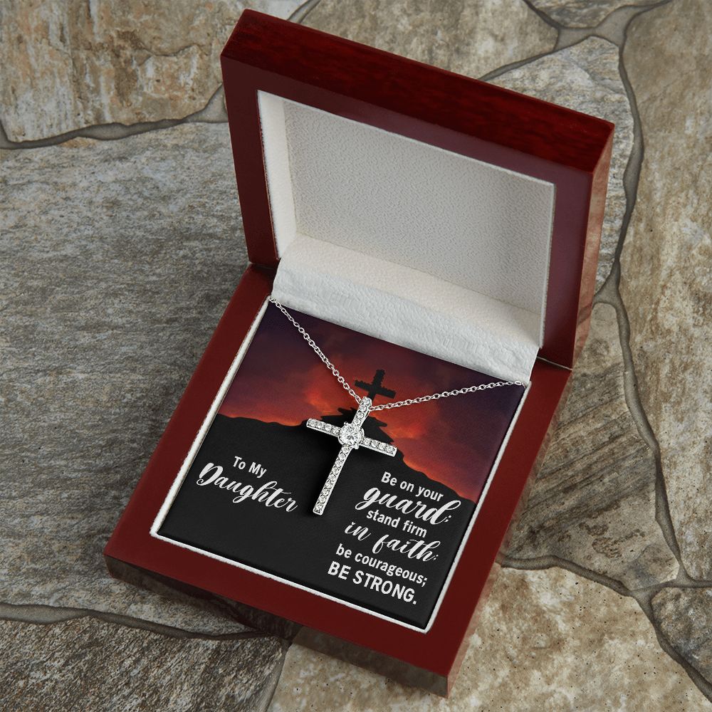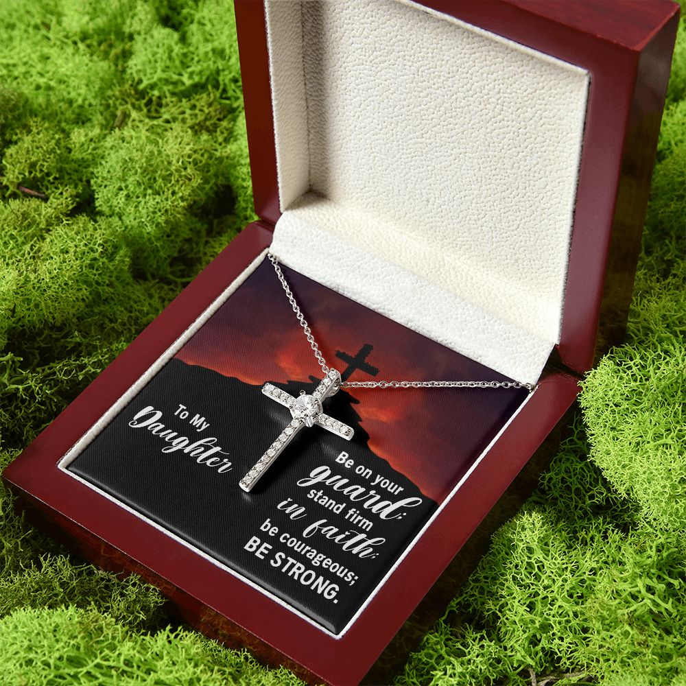 To My Daughter | Be on your guard; stand firm in Faith; be courageous; Be strong. - CZ Cross Necklace