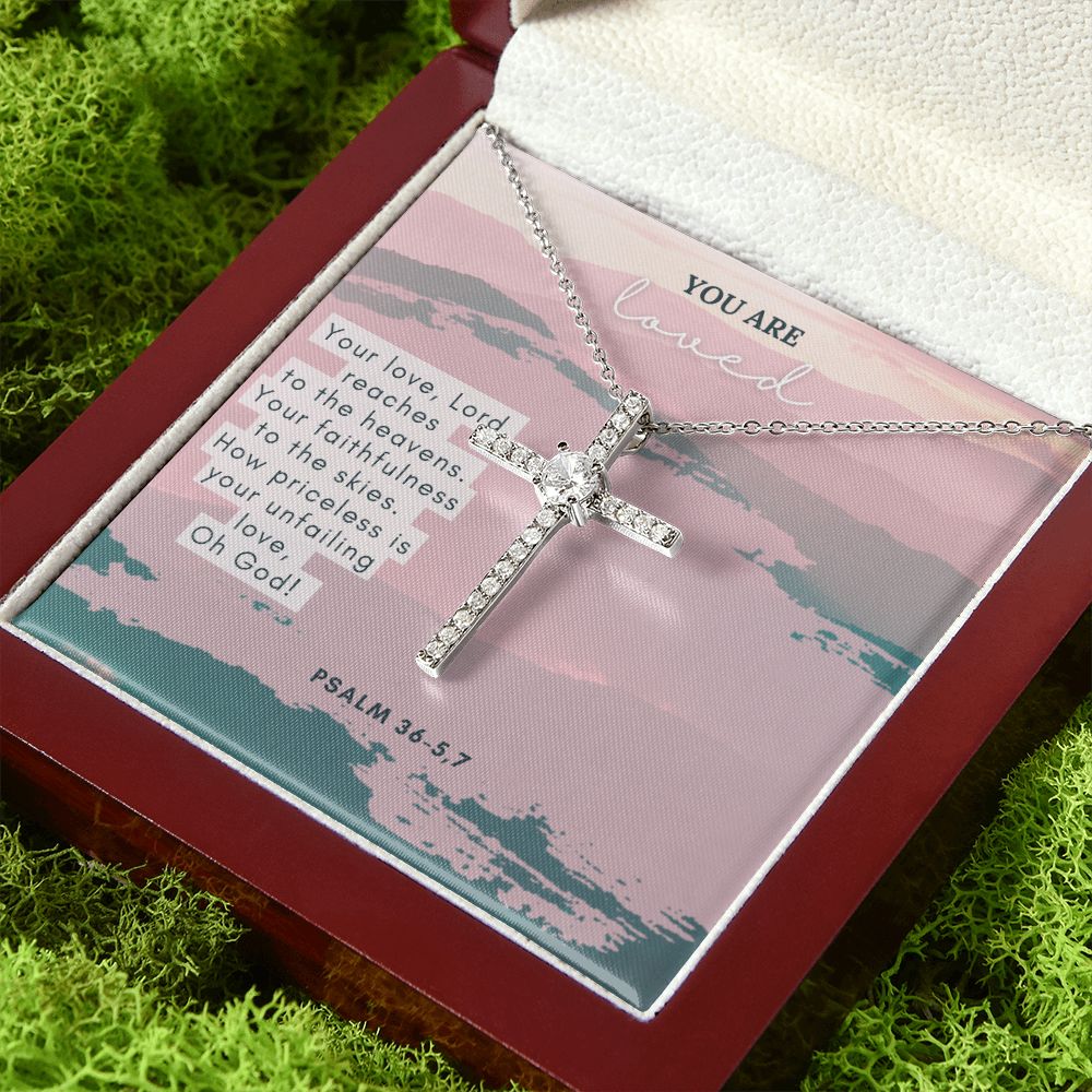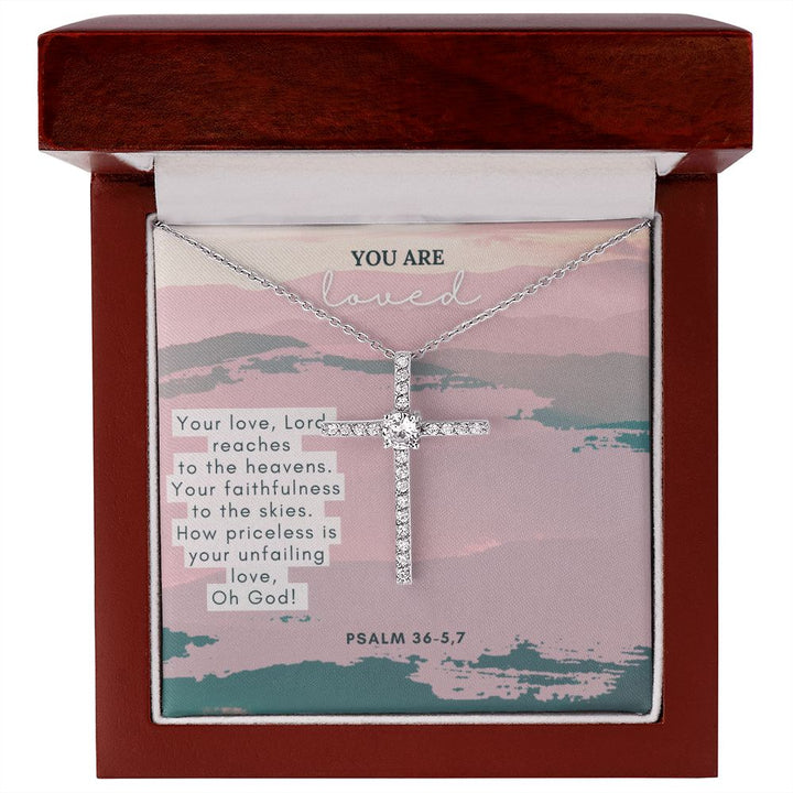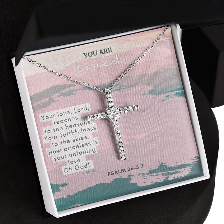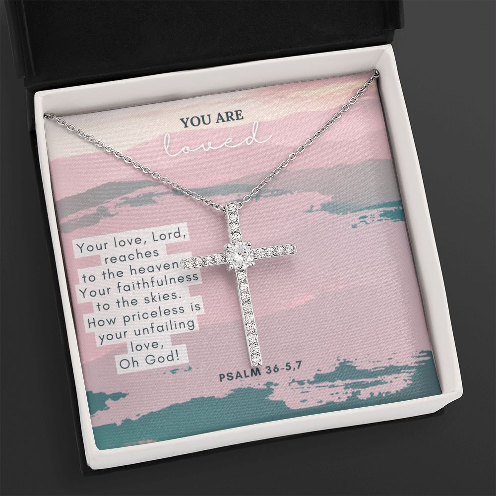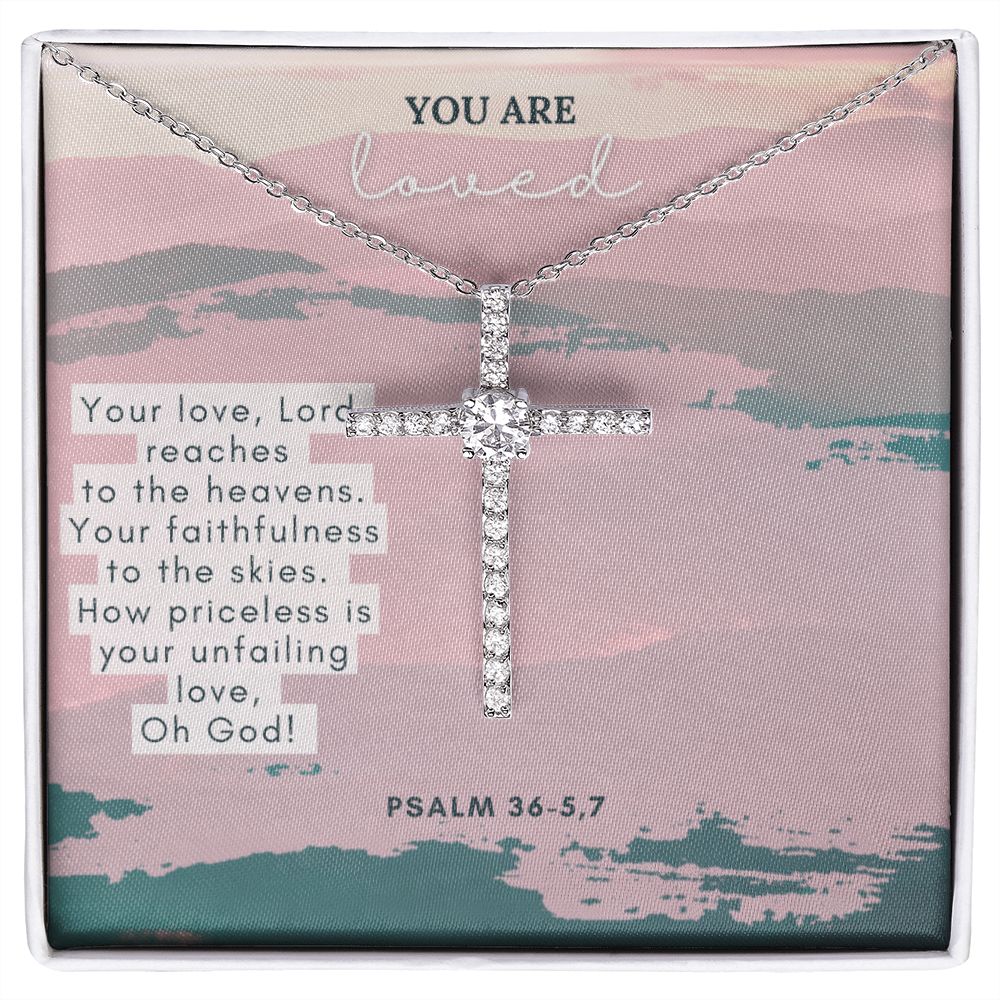 You are Loved | Your Love, Lord reaches to the heavens. Your faithfulness to the skies. How priceless is your unfailing love, Oh God! Psalm 36-5,7 - CZ Cross Necklace