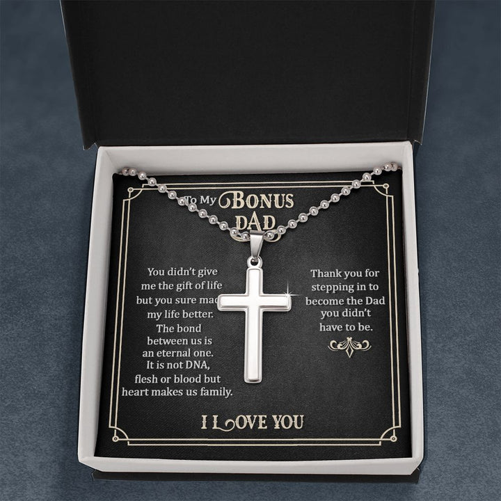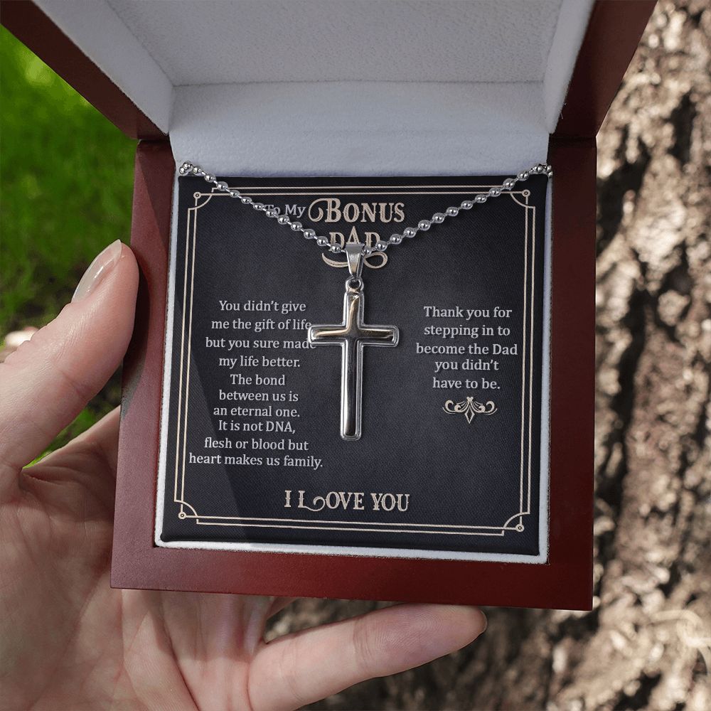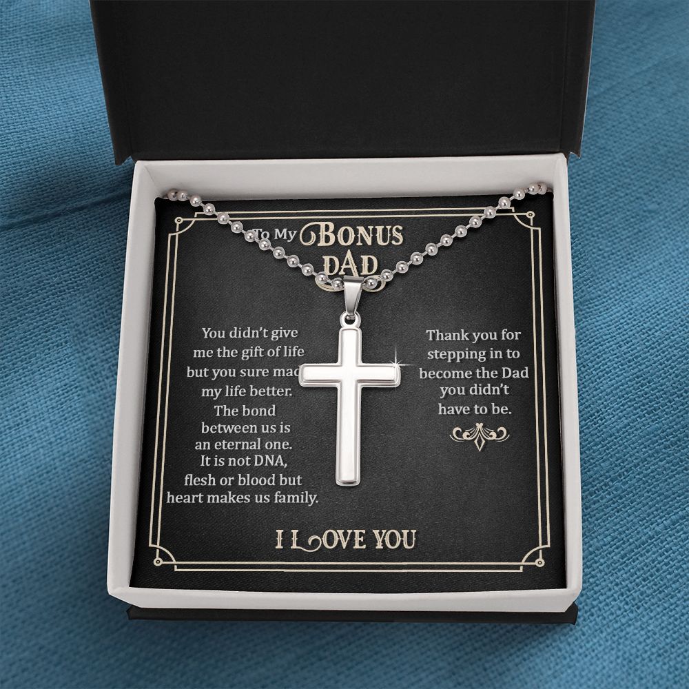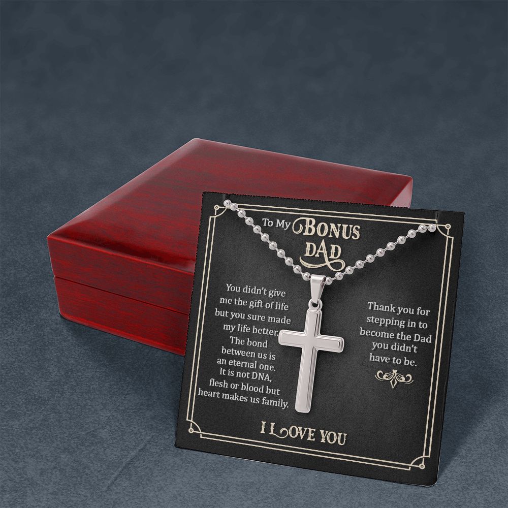 To My Bonus Dad | Thank you for stepping in to become the Dad you didn't have to be. - Stainless Cross Necklace with Ball Chain