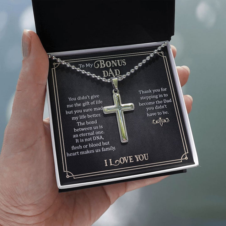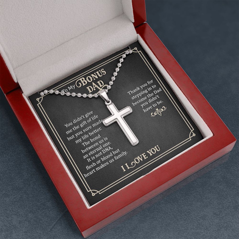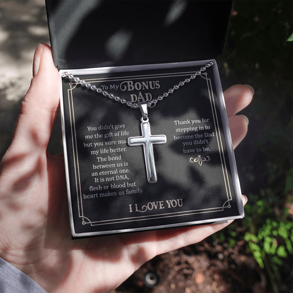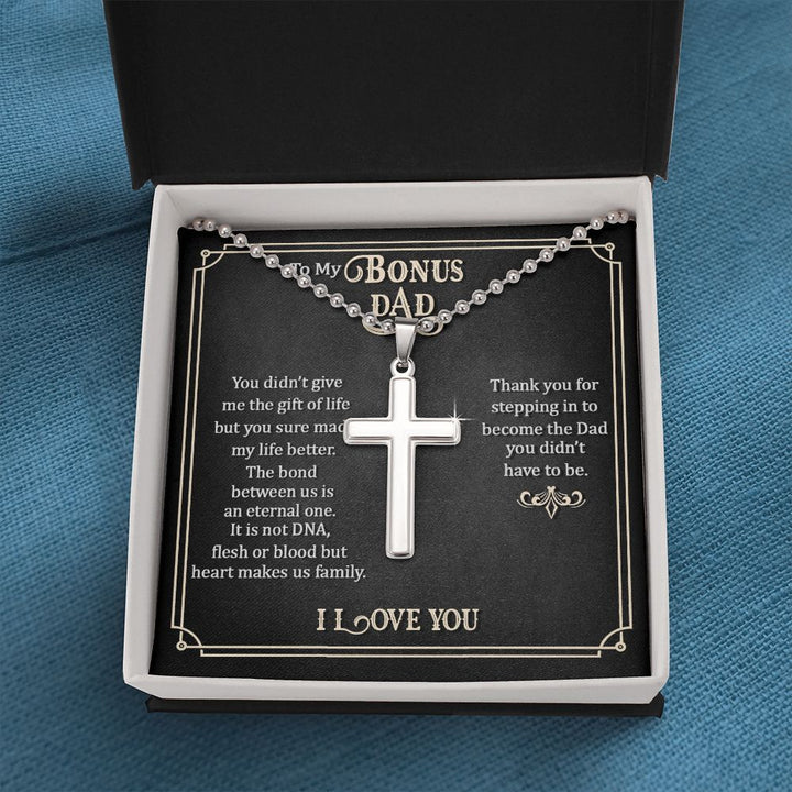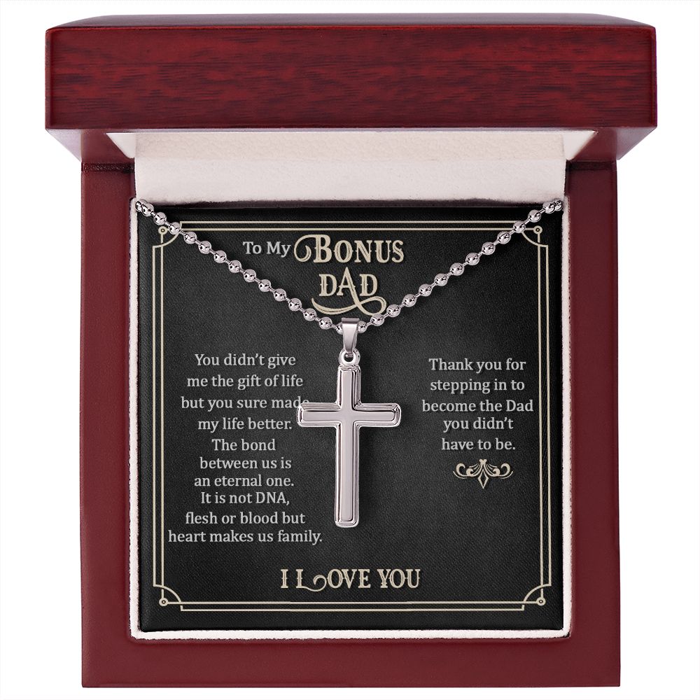 To My Bonus Dad | Thank you for stepping in to become the Dad you didn't have to be. - Stainless Cross Necklace with Ball Chain