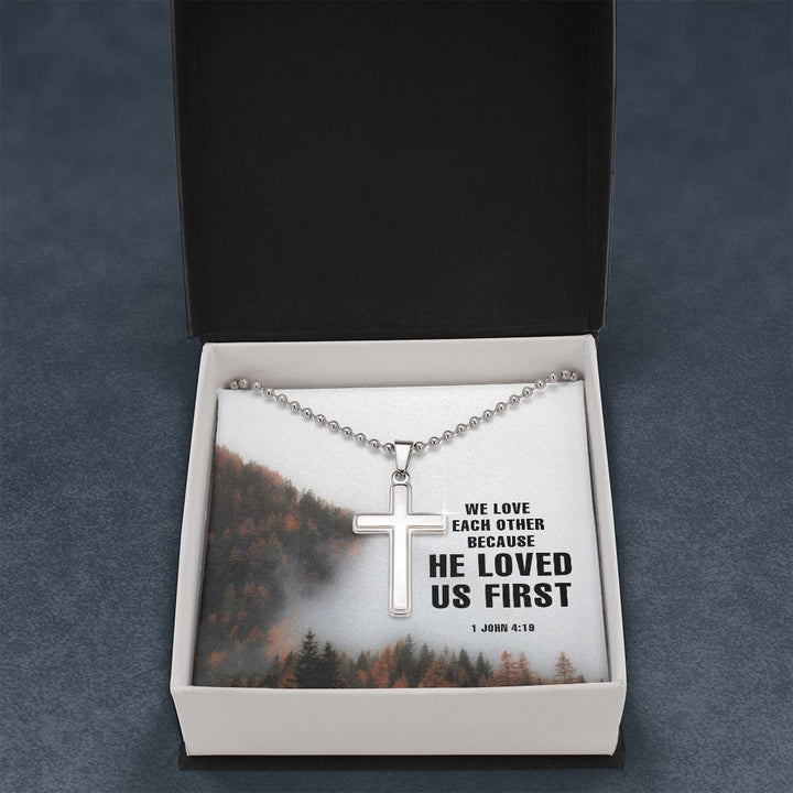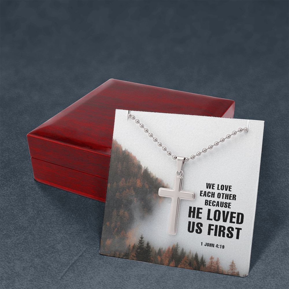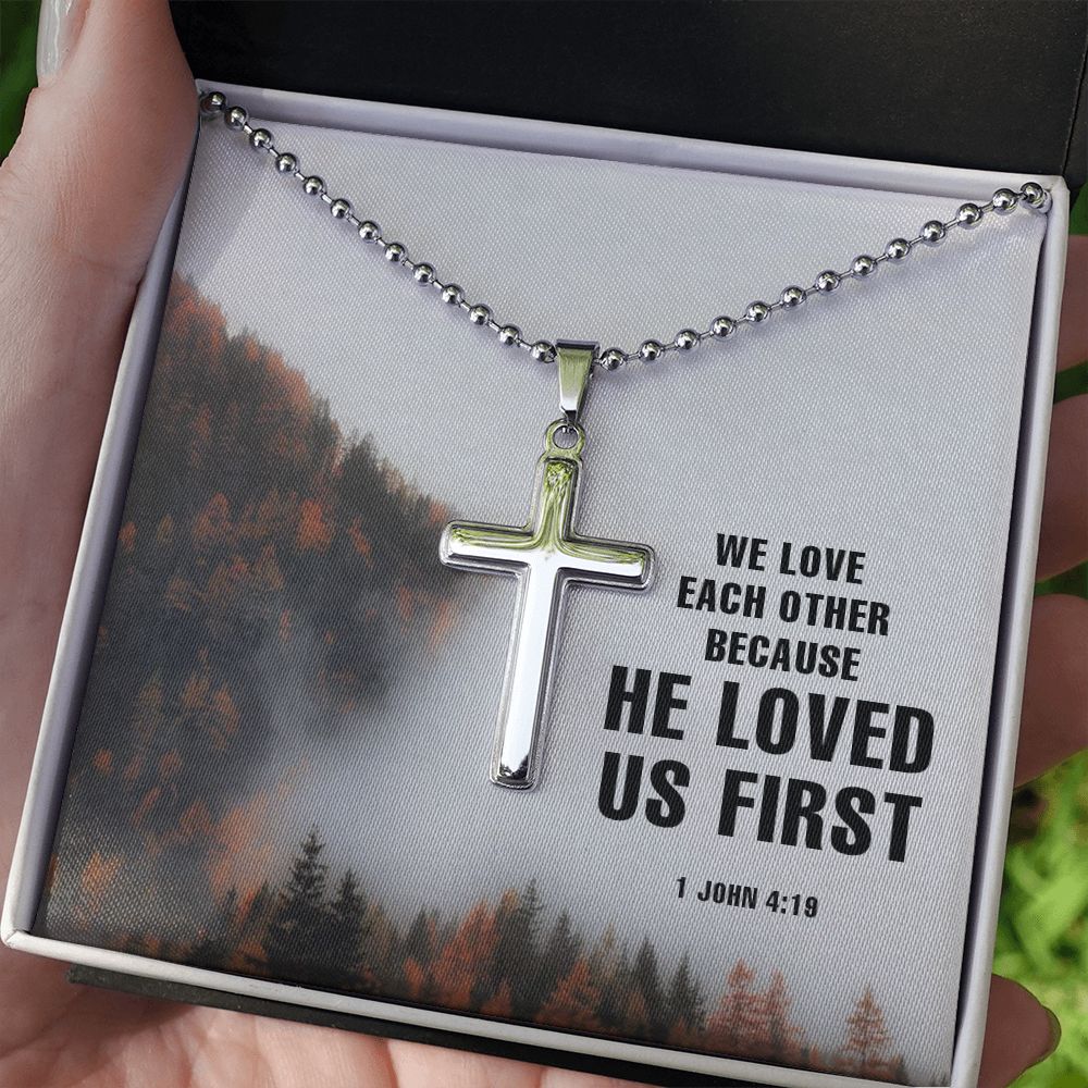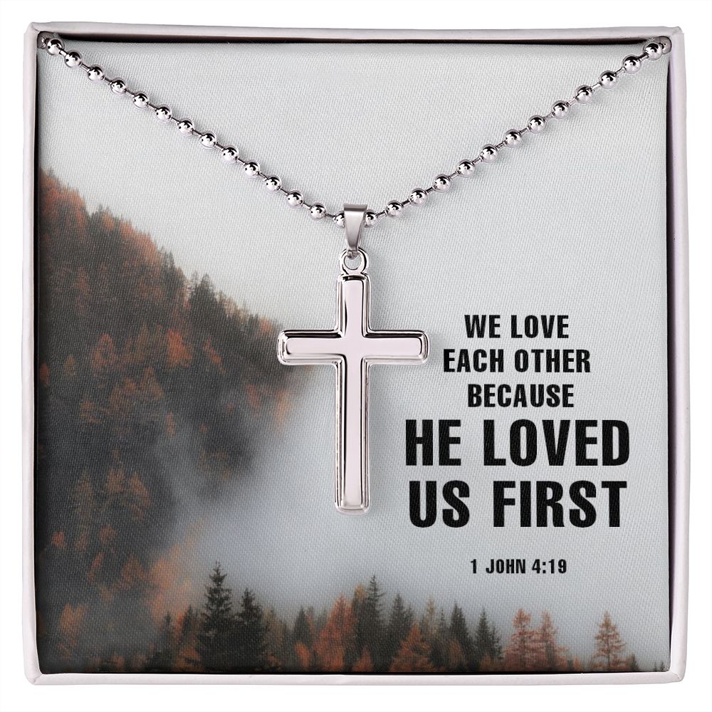 We Love each other because He Loved us First. 1 John 4:19 - Stainless Cross Necklace with Ball Chain