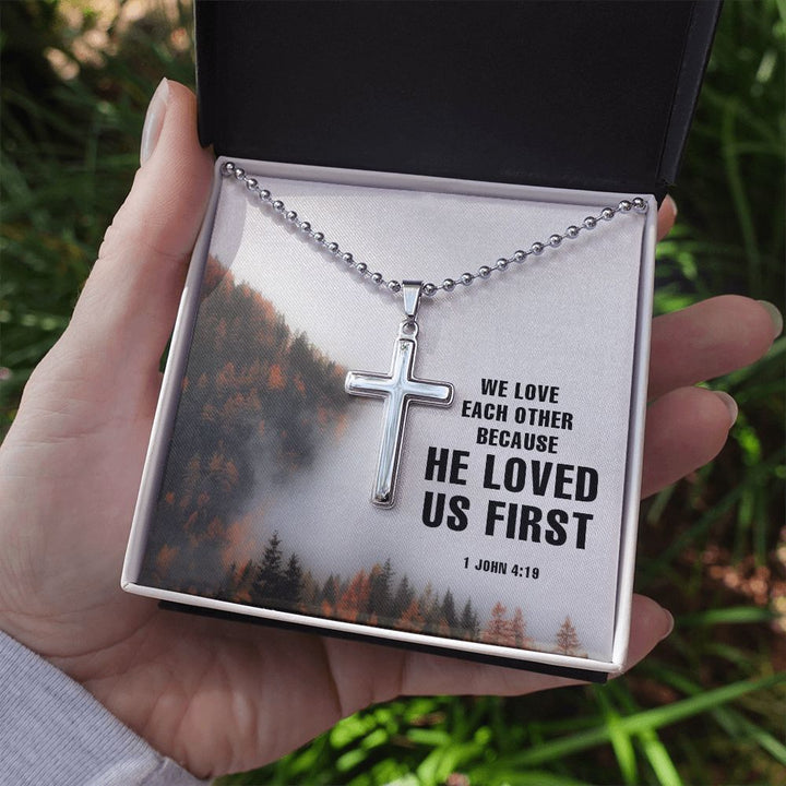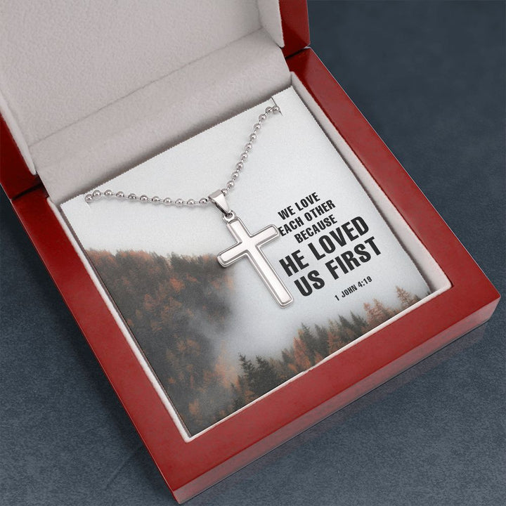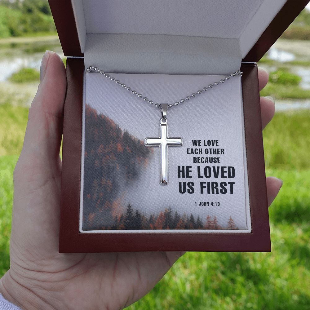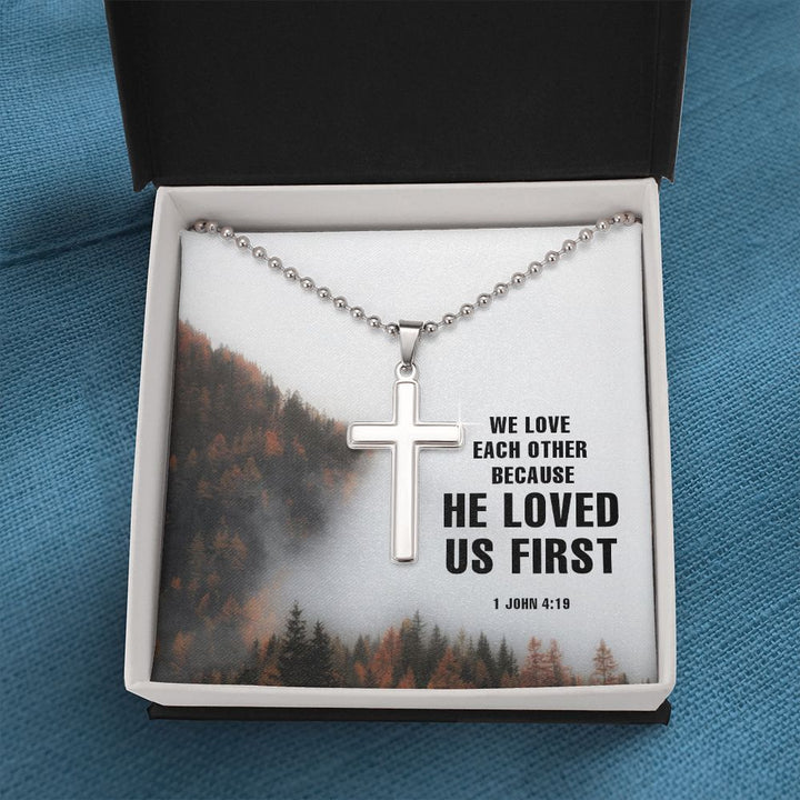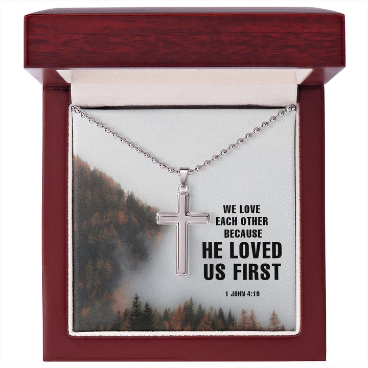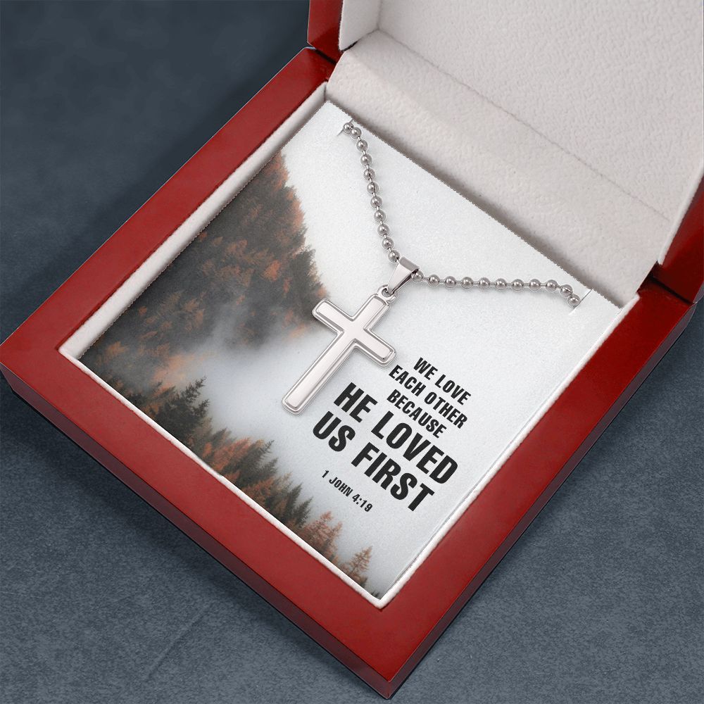 We Love each other because He Loved us First. 1 John 4:19 - Stainless Cross Necklace with Ball Chain