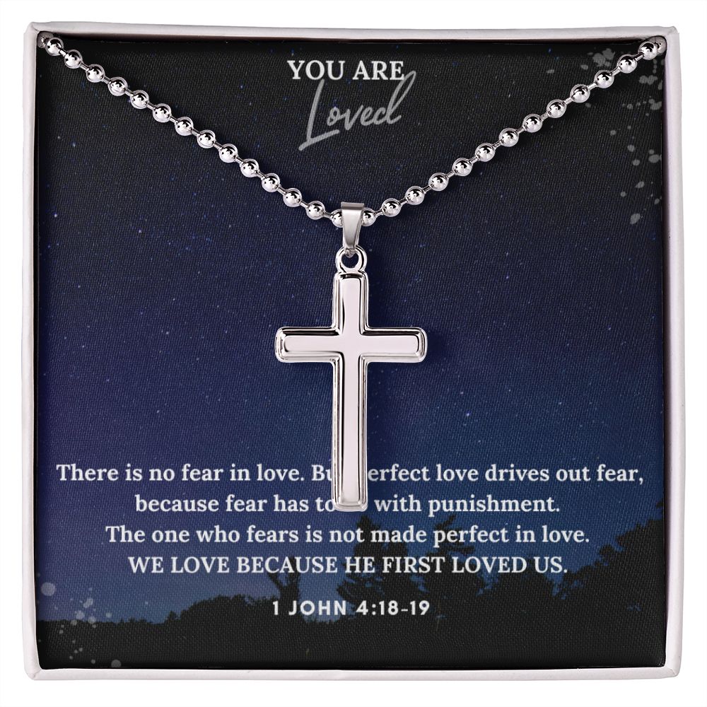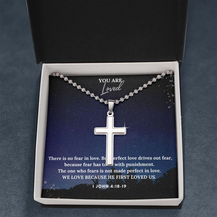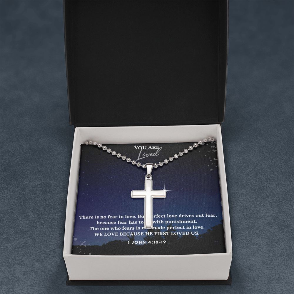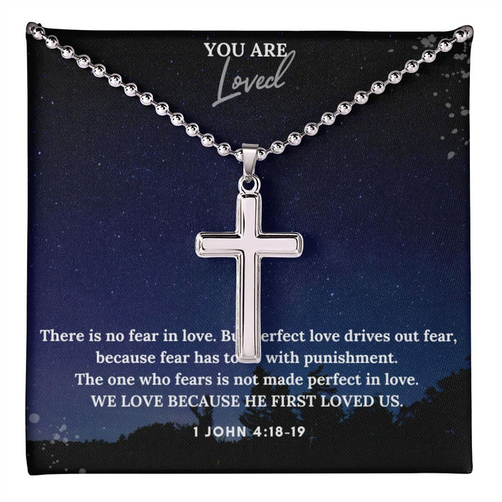 You are Loved | We Love because He first loved us. 1 John 4:18-19 - Stainless Cross Necklace with Ball Chain