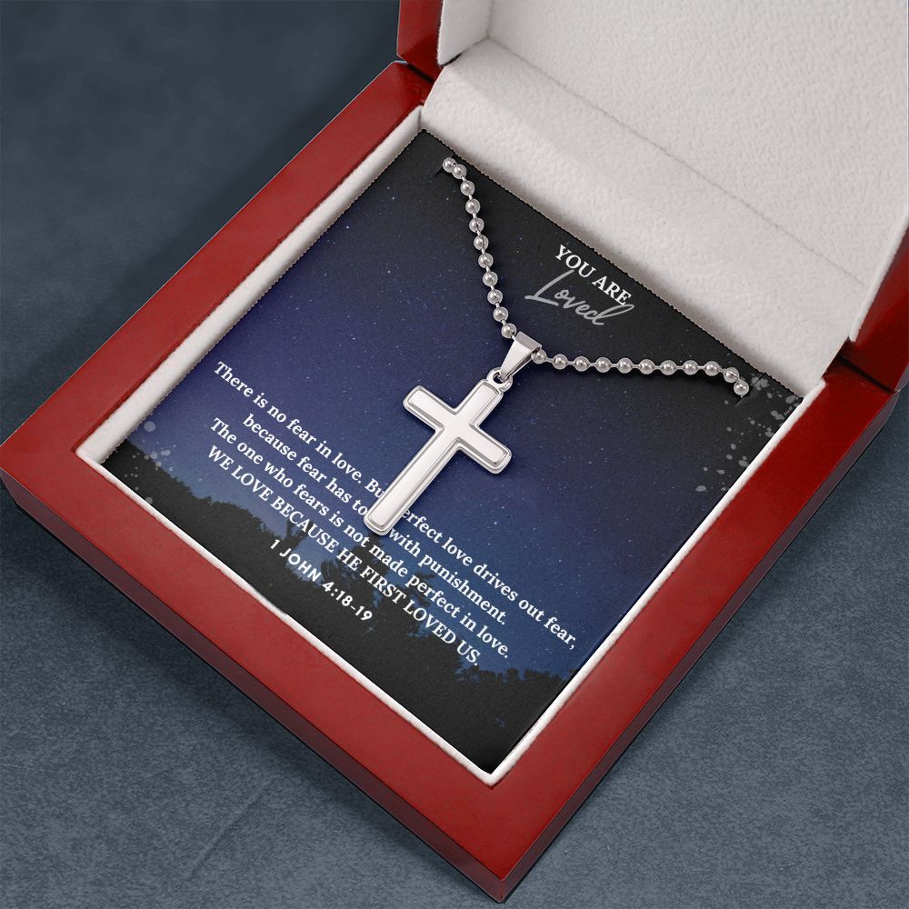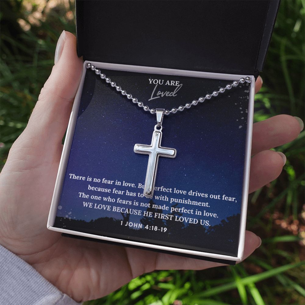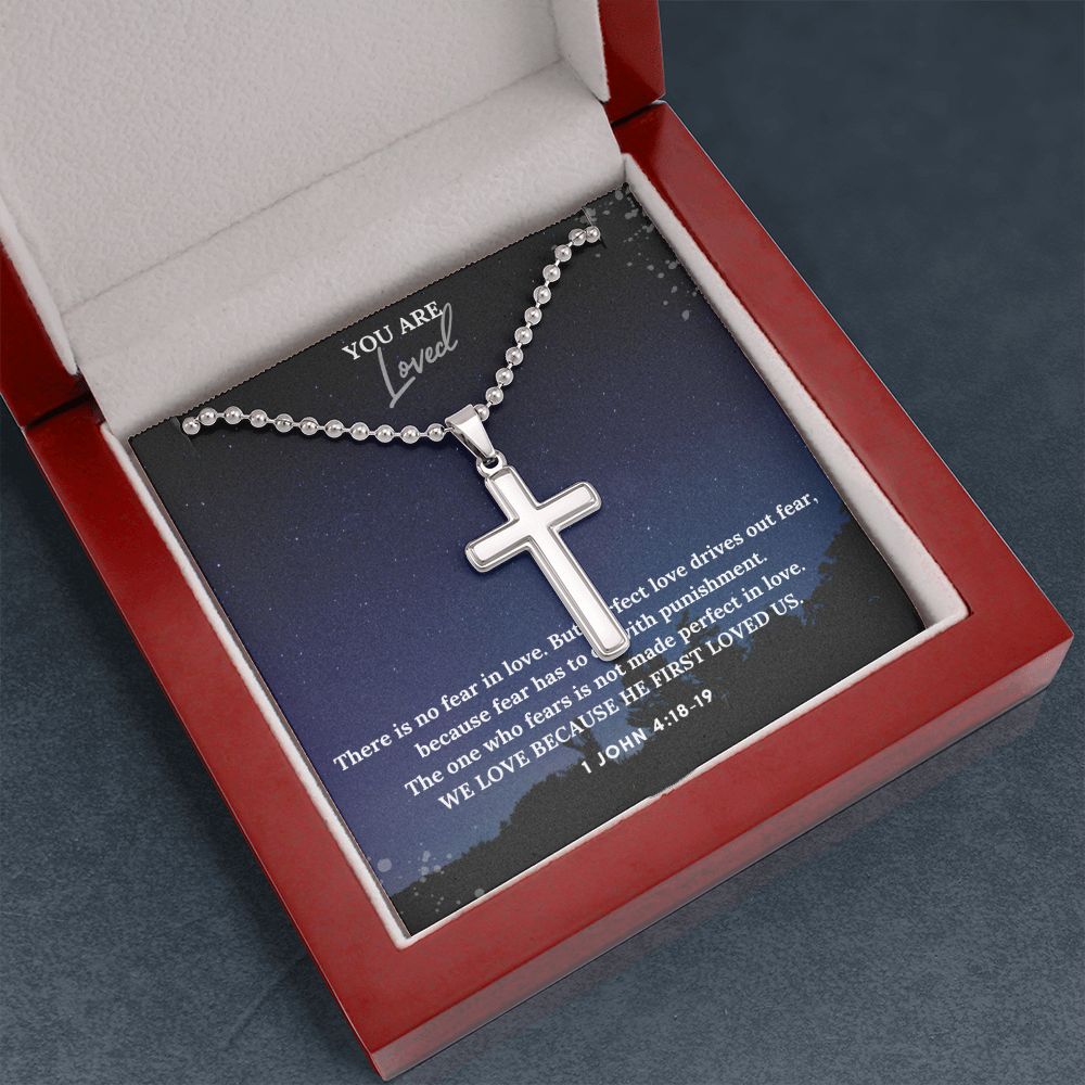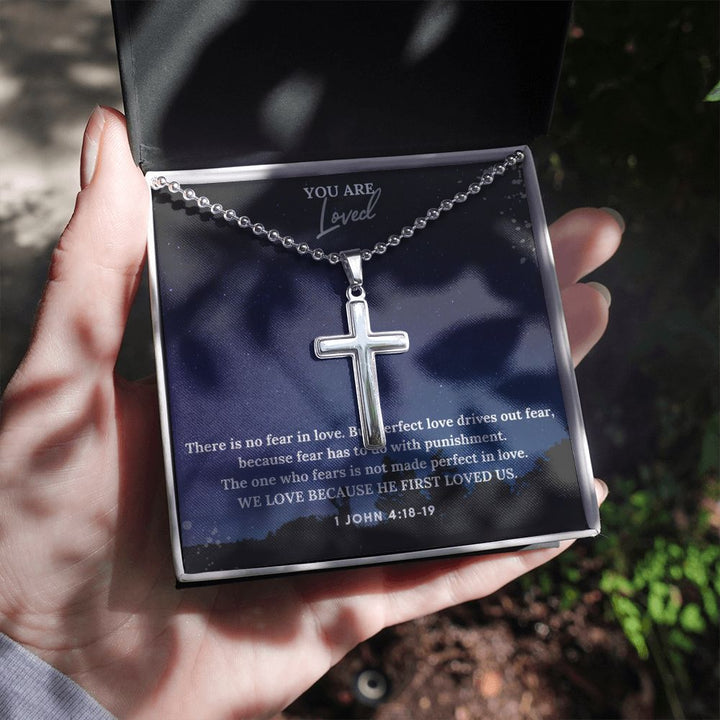 You are Loved | We Love because He first loved us. 1 John 4:18-19 - Stainless Cross Necklace with Ball Chain
